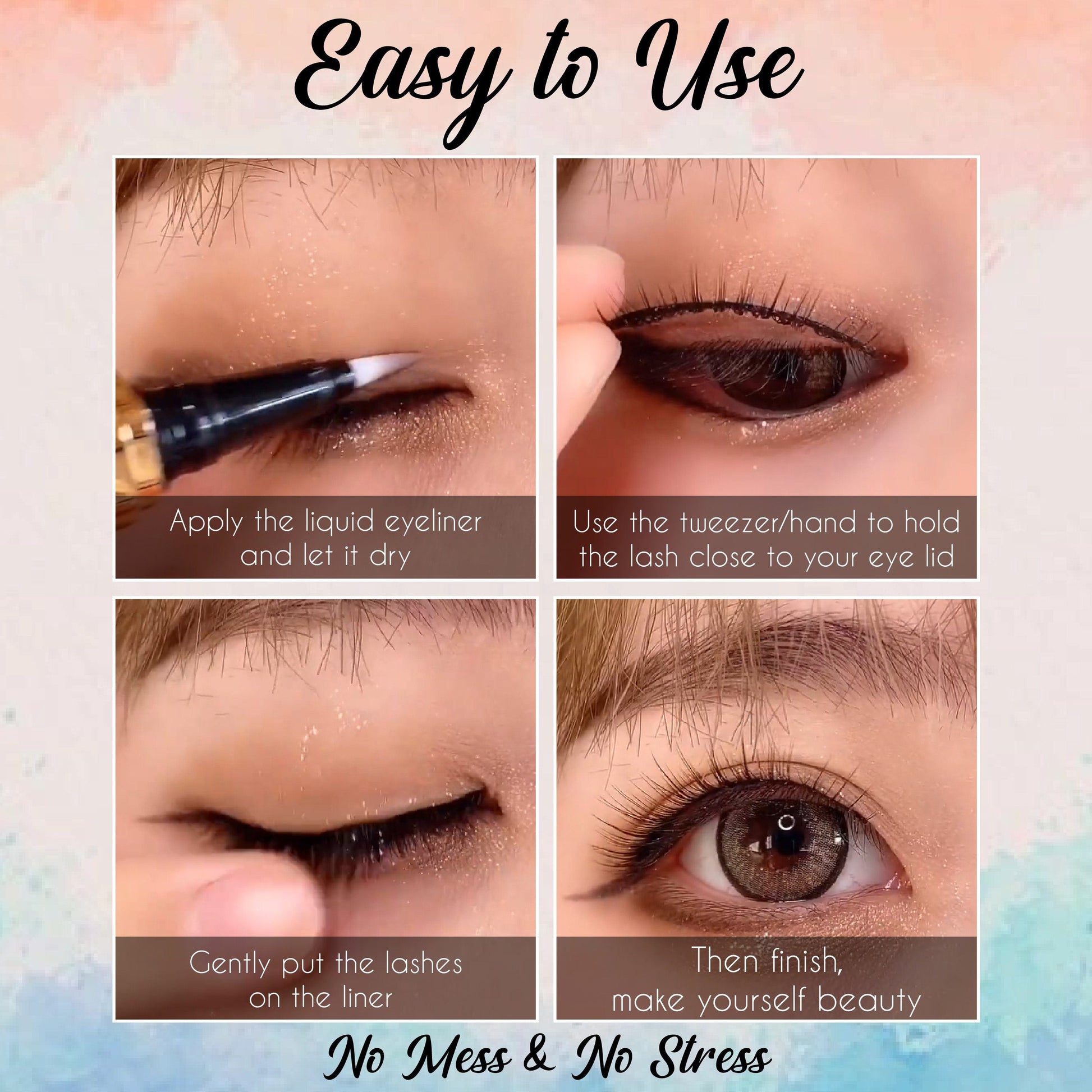 What you have to do is just to draw an eye-line with our perfect glue eyeliner and put on your own favorite false eyelashes! The ink from the eyeliner will also work as strong glue for holding the false eyelashes perfectly!